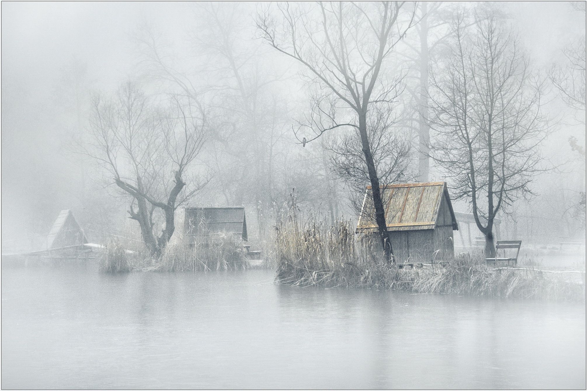 Melancholy and silence around the abandoned huts on a misty winter day in Sződliget, Hungary