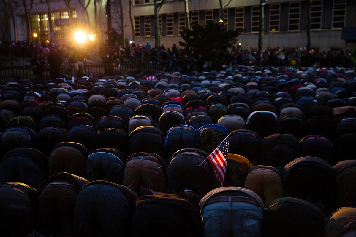 Men pray during a protest by ethinic Yemenis and supporters over President Donald Trump's executive order temporarily banning immigrants and refugees from seven Muslim-majority countries, including Yemen on February 2, 2017 in the Brooklyn borough of New York City. At least 1,000 Yemeni-owned bodegas and grocery-stores across the city shut down from noon to 8 p.m. today to protest the order. (Photo by Lori Hawkins)