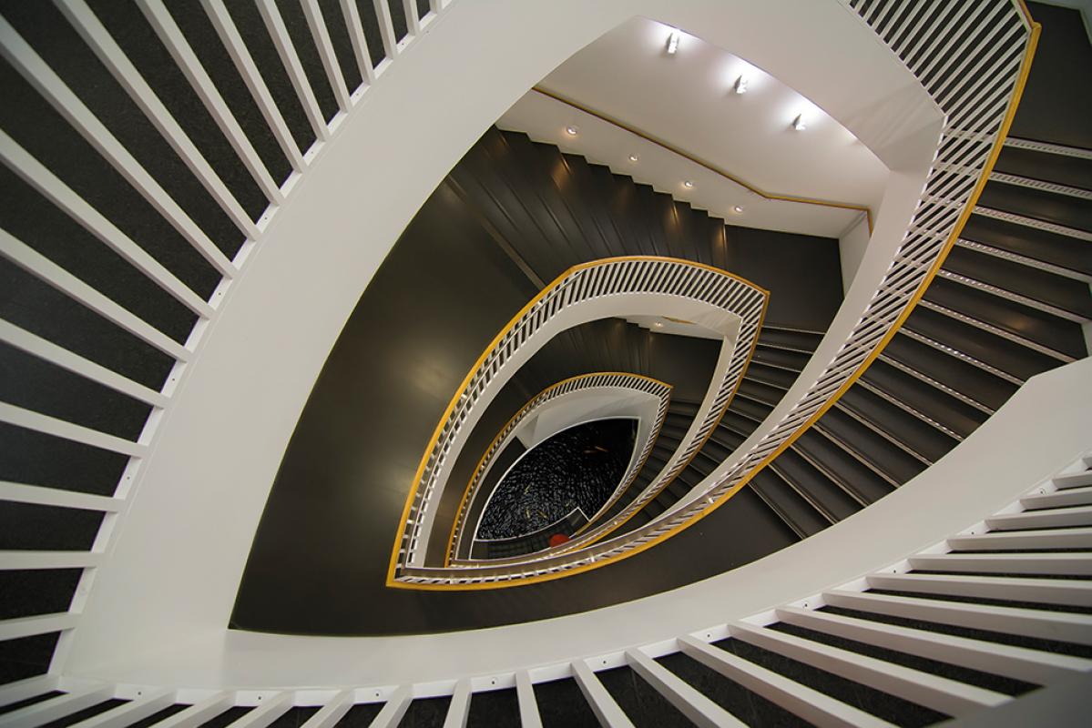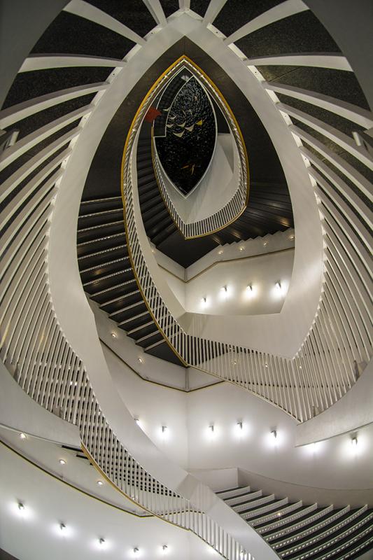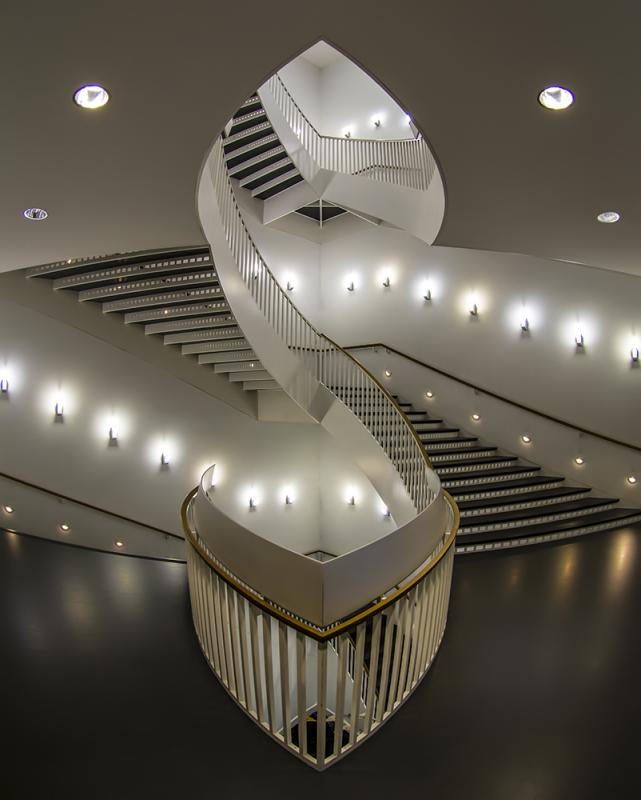 The staircase in the Museum of Contemporary Art in Chicago (IL) taken with unusual camera angles to simultaneously play with its shapes and lights, creating symmetrical and opposite eyes, or strange views that remind Escher's works of art.