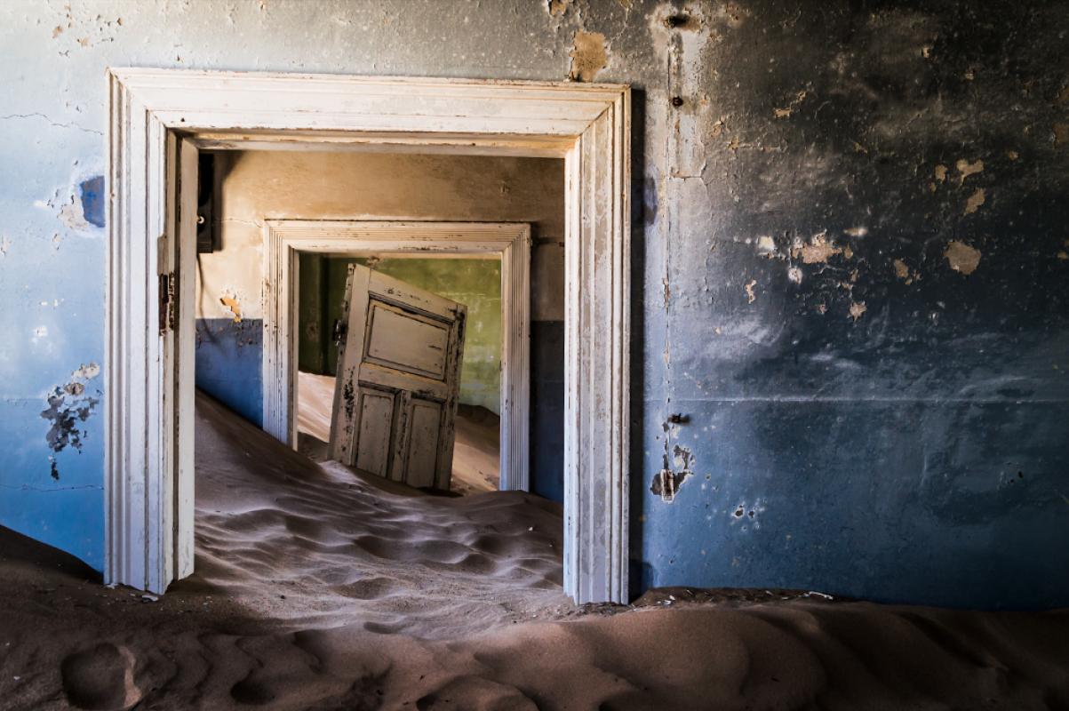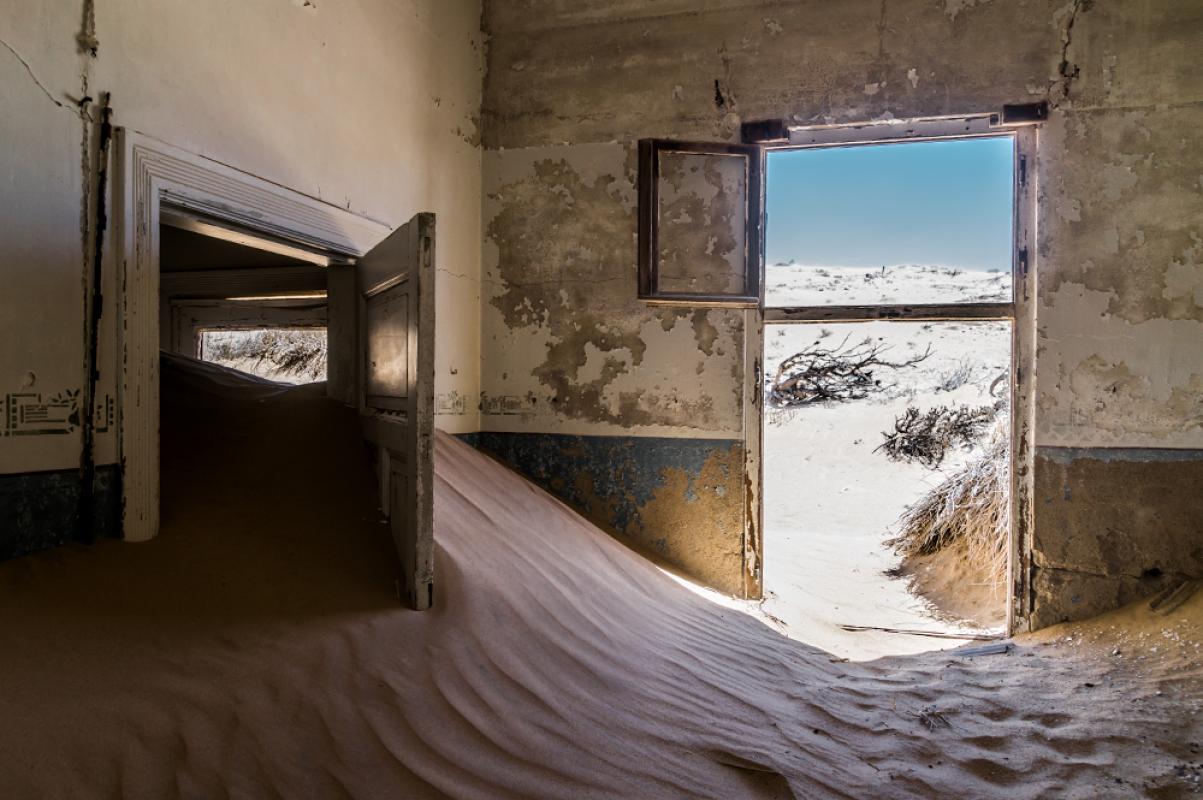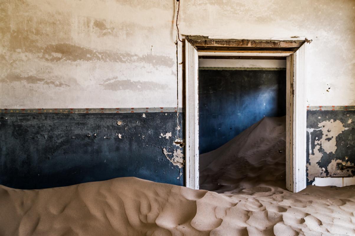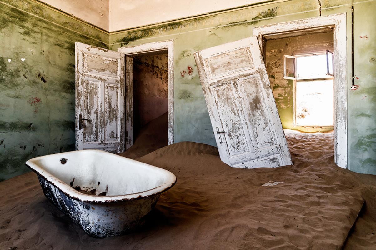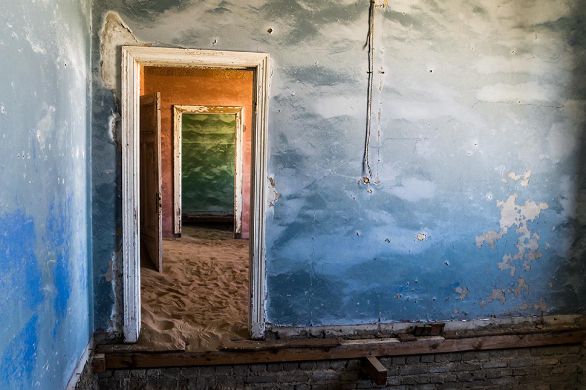 This series depicts a grim, dystopian image of our potential future planet - A future planet in which humanity has vanished from certain regions or the surface of earth entirely. It is very well imaginable that resource depletion, increasing desertification, global warming or the use of weapons of mass destruction could turn precious living space inhabitable. Kolmanskop, Namibia serves as a powerful representative and warning for such man-made civilizatory downfall and the transience of our existence – a formerly prosperous settlement abandoned due to the depletion of a diamond mine now slowly being claimed back by the desert.