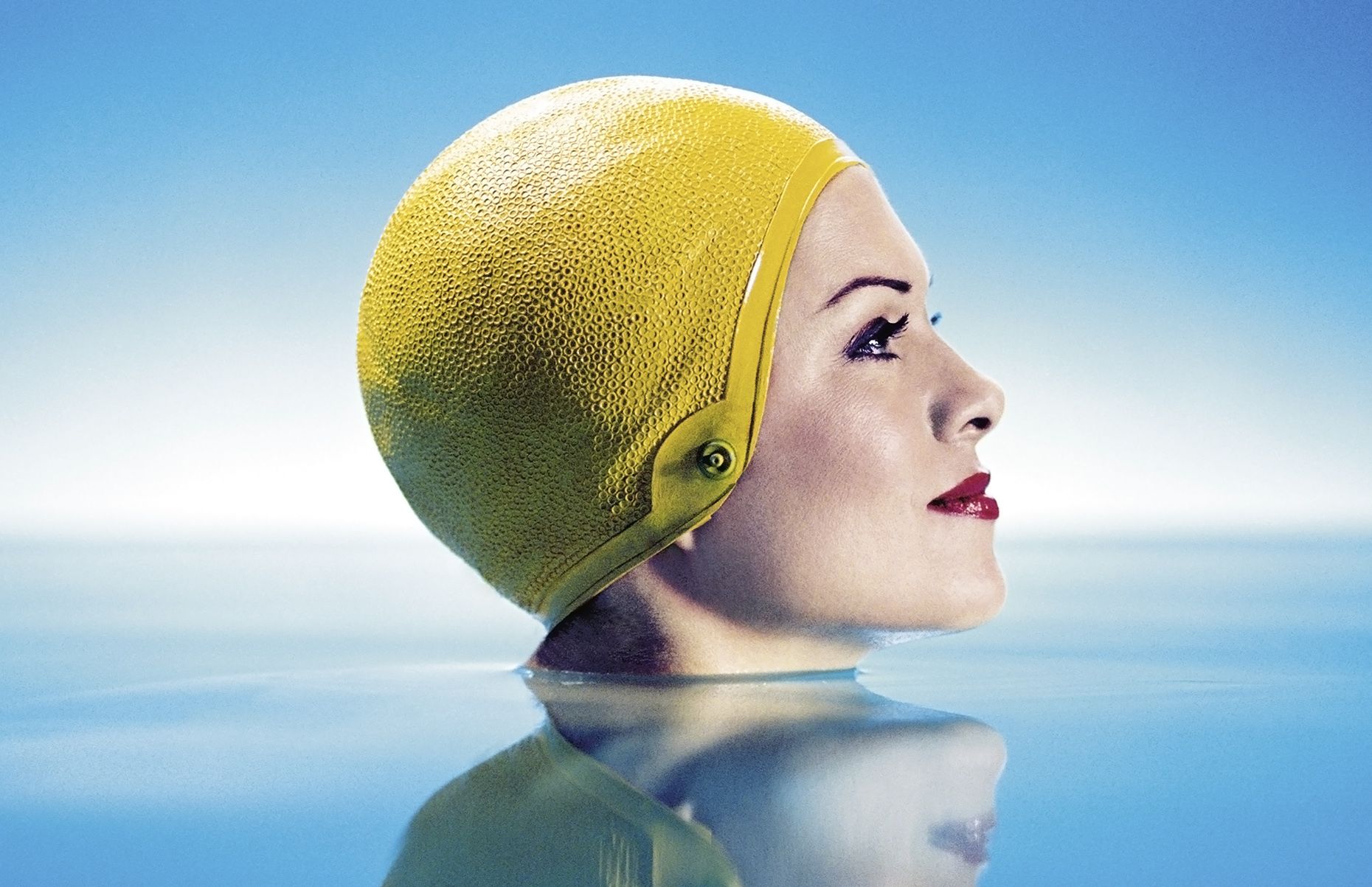 Beautiful woman in pool of water wearing yellow bathing cap