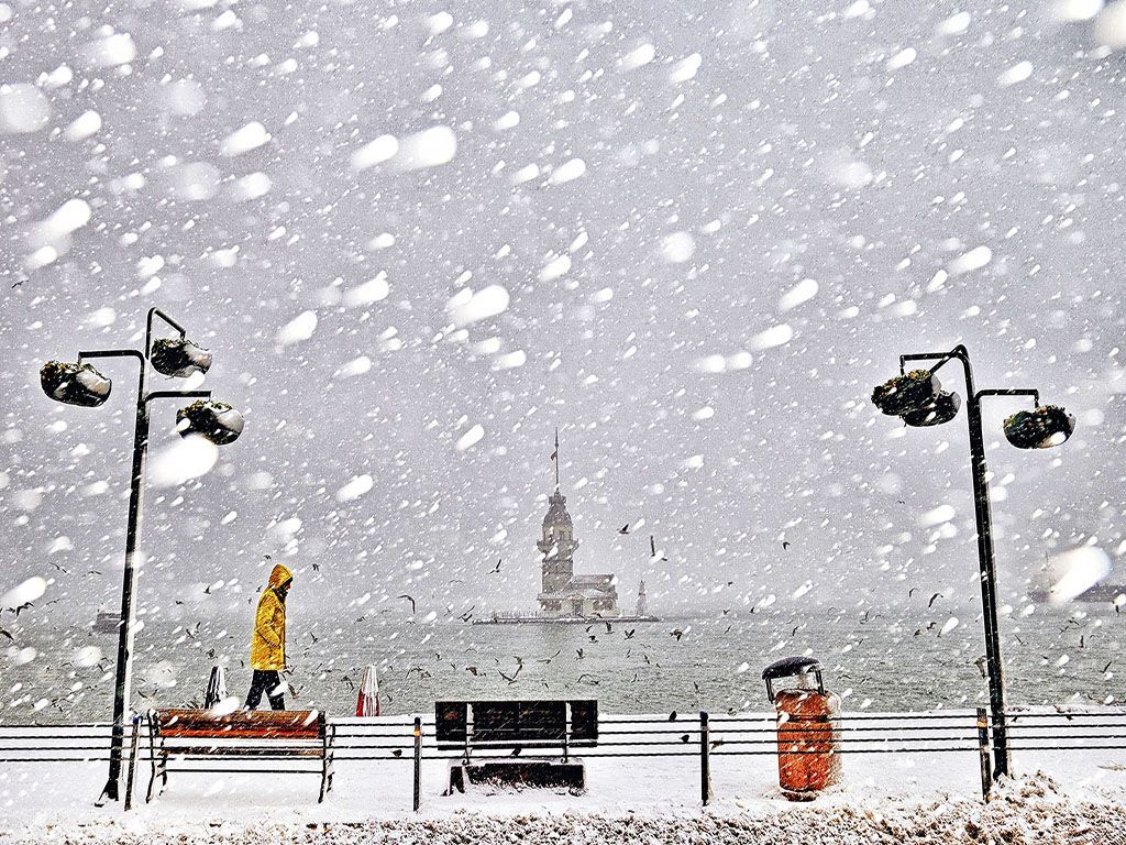 Maiden's Tower and under heavy snowfall during the winter months an incredible moment in Turkey's Istanbul province