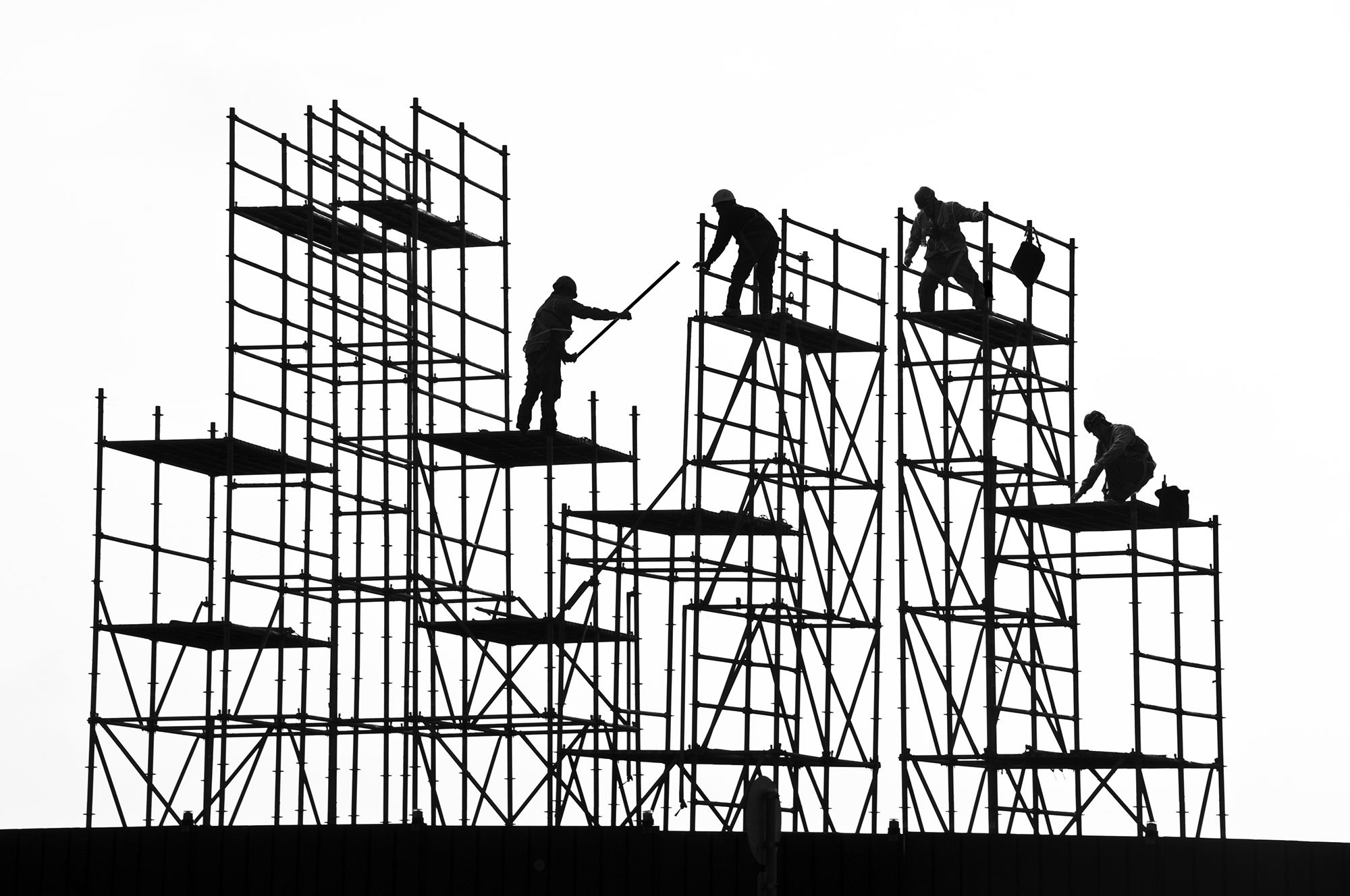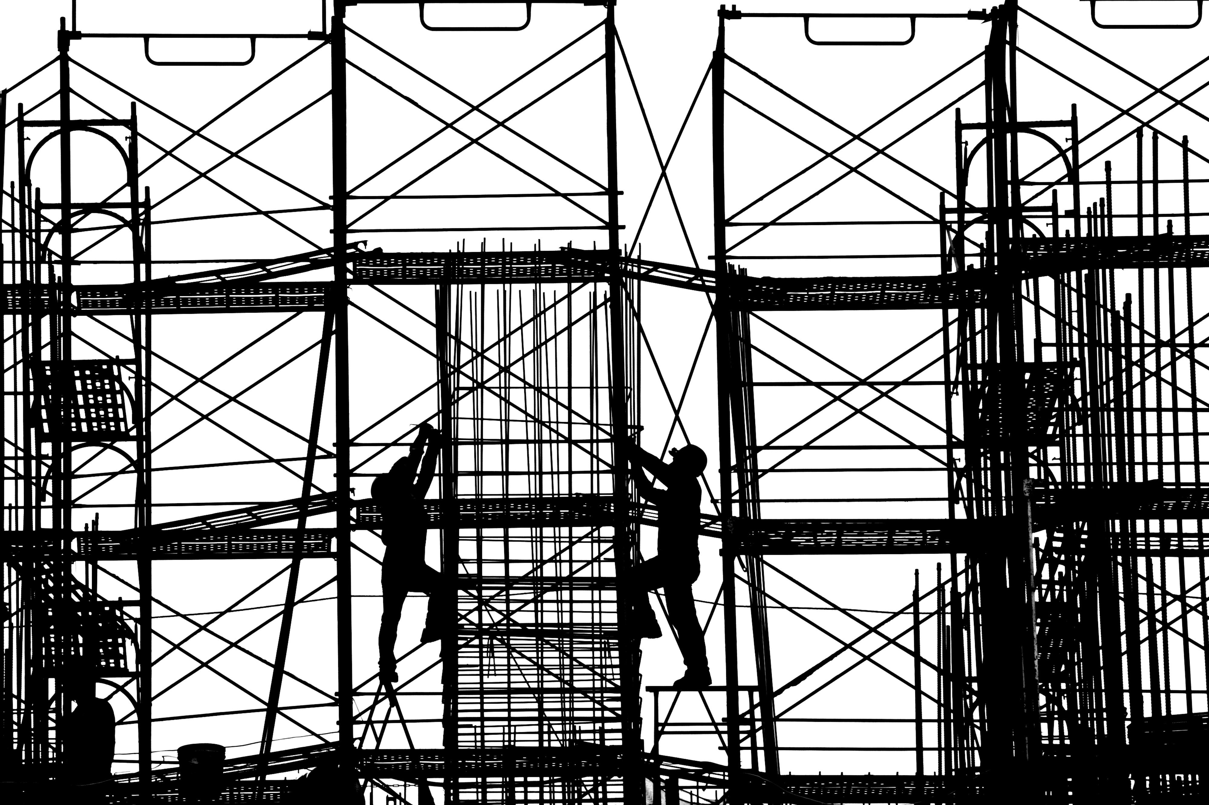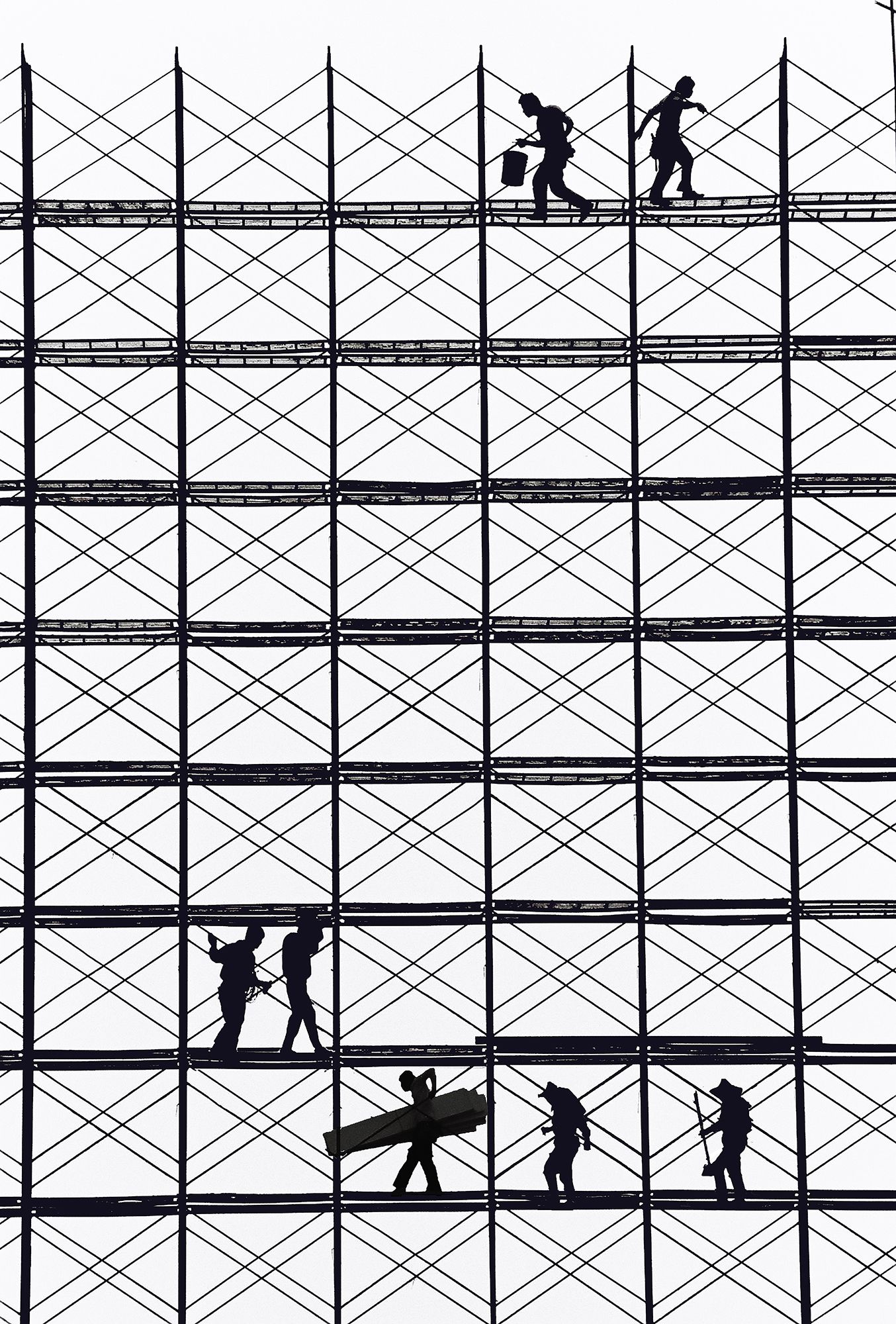 When I creat the series, “Rhythm on the shelf”, I attempt to find some uniqueness and sense of artistic of the structure while it is under construction. In this series, I consider scaffolding, reinforcing bars and steels as strings and stave.I take the workers on shelf as musical note.The whole series shows the view with high contrast and surreal.