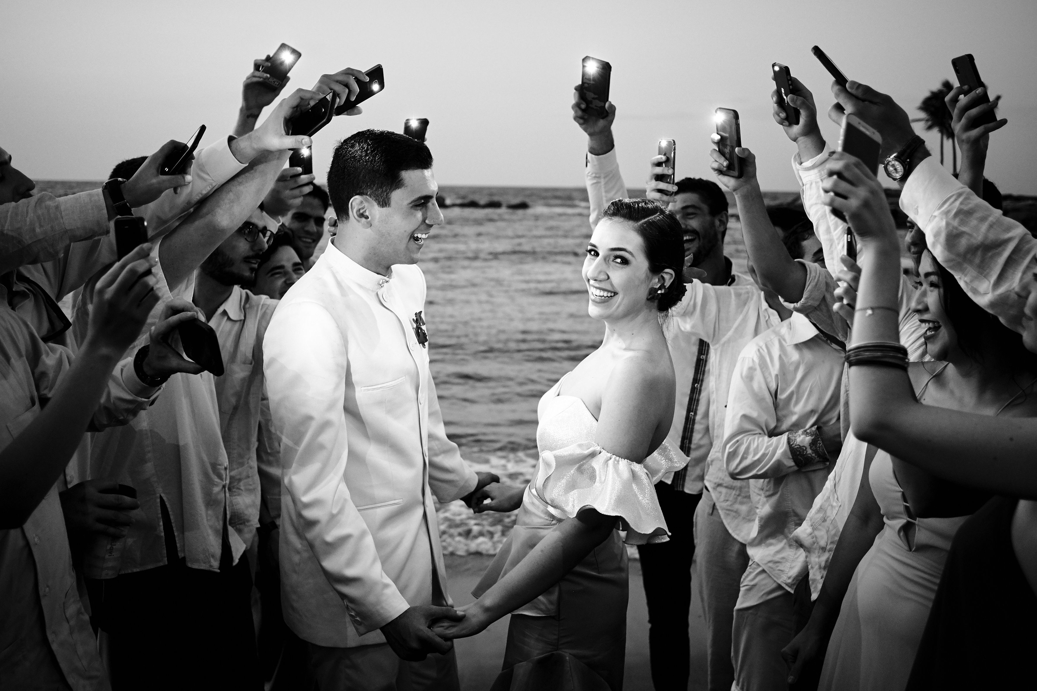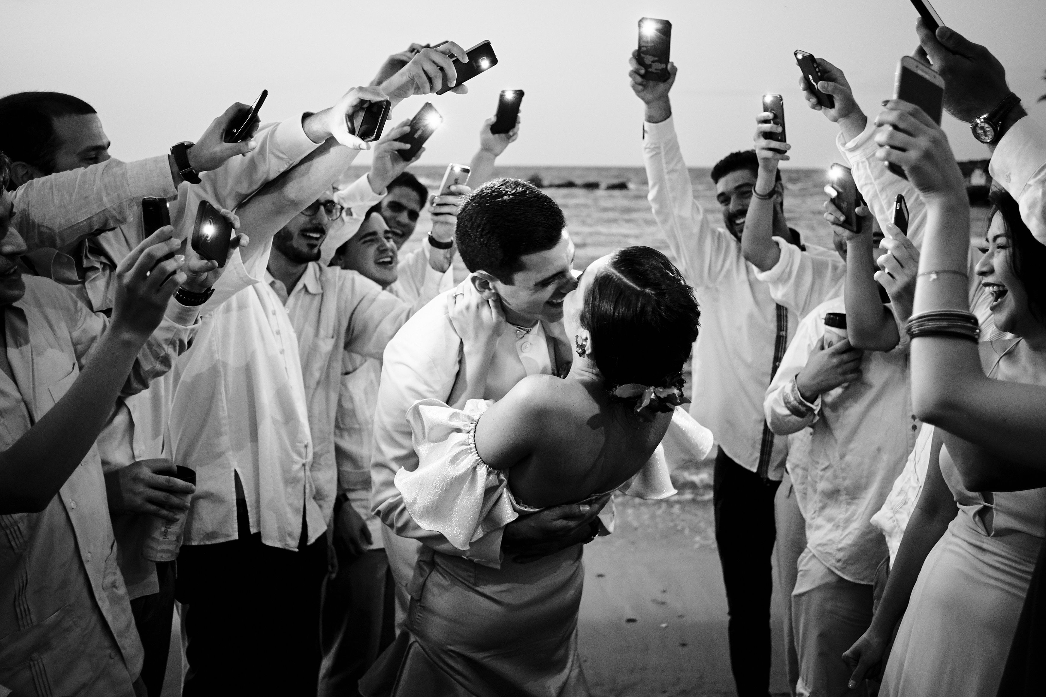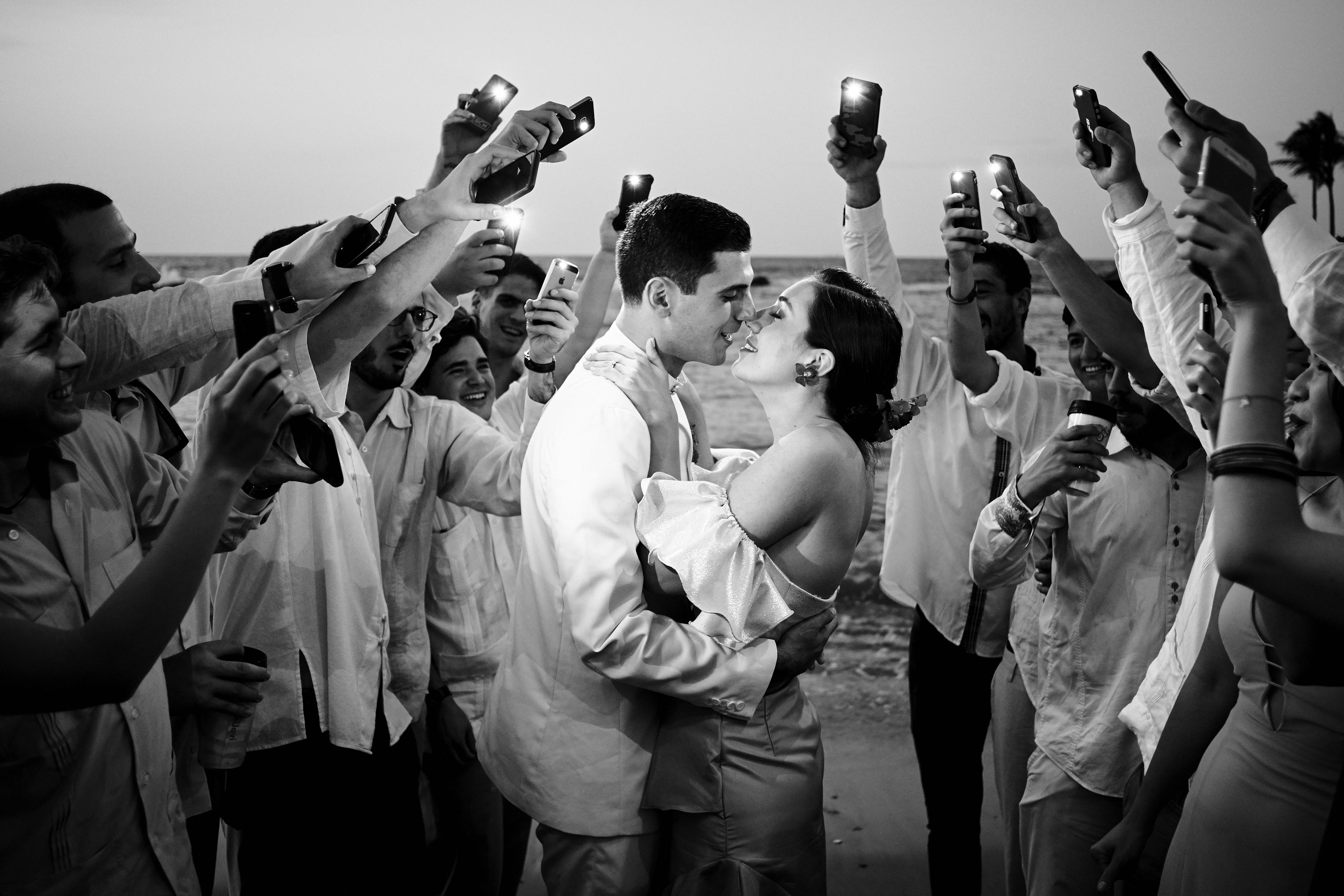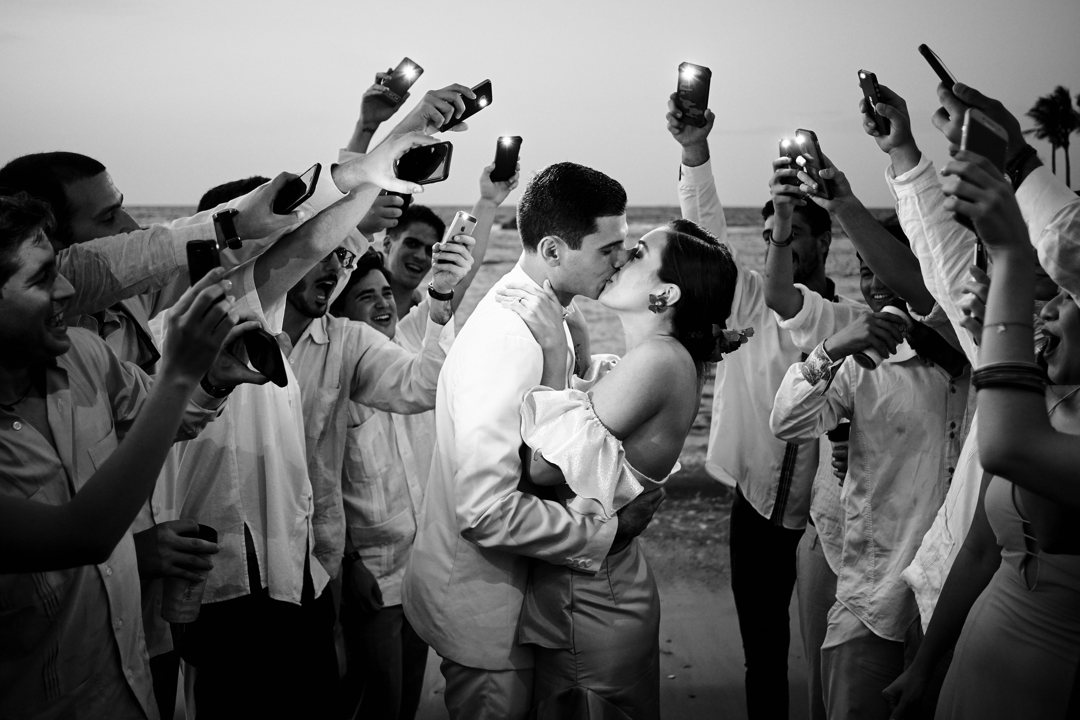 The bride and groom were about to have their first kiss as a married couple, so every guest and friend took out their mobile phone to capture the moment, because the light was so dim and the people were so exited I asked everyone to get closer and turn on their cellphone’s lights and together we witness and capture that moment. Catia La Mar, Venezuela. June 23 of 2018