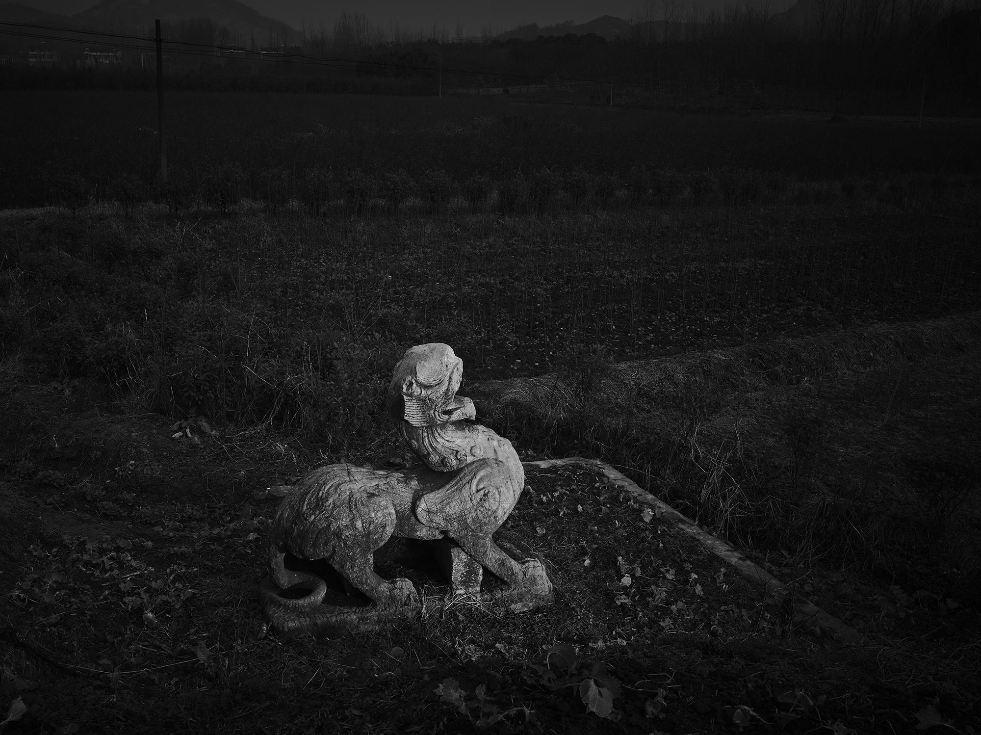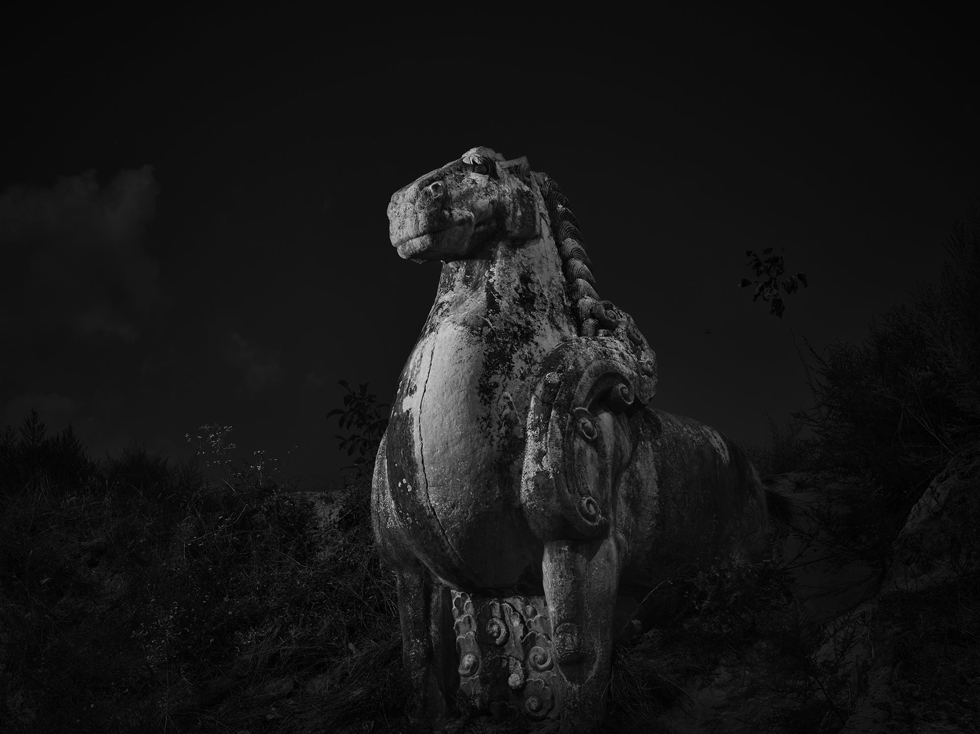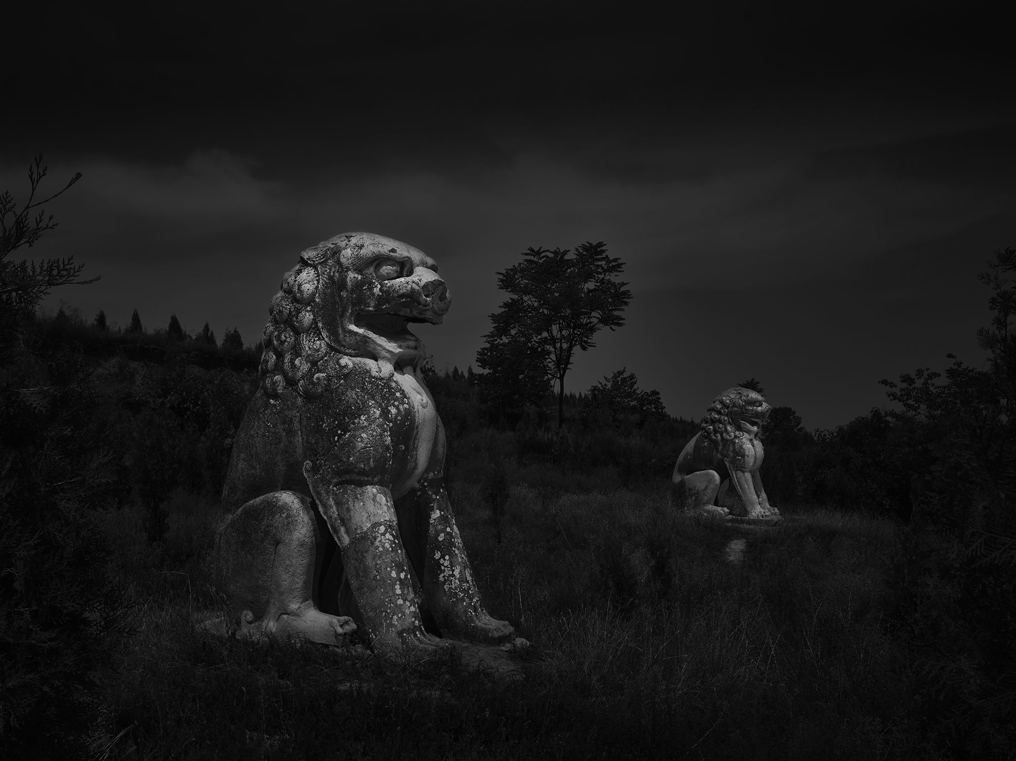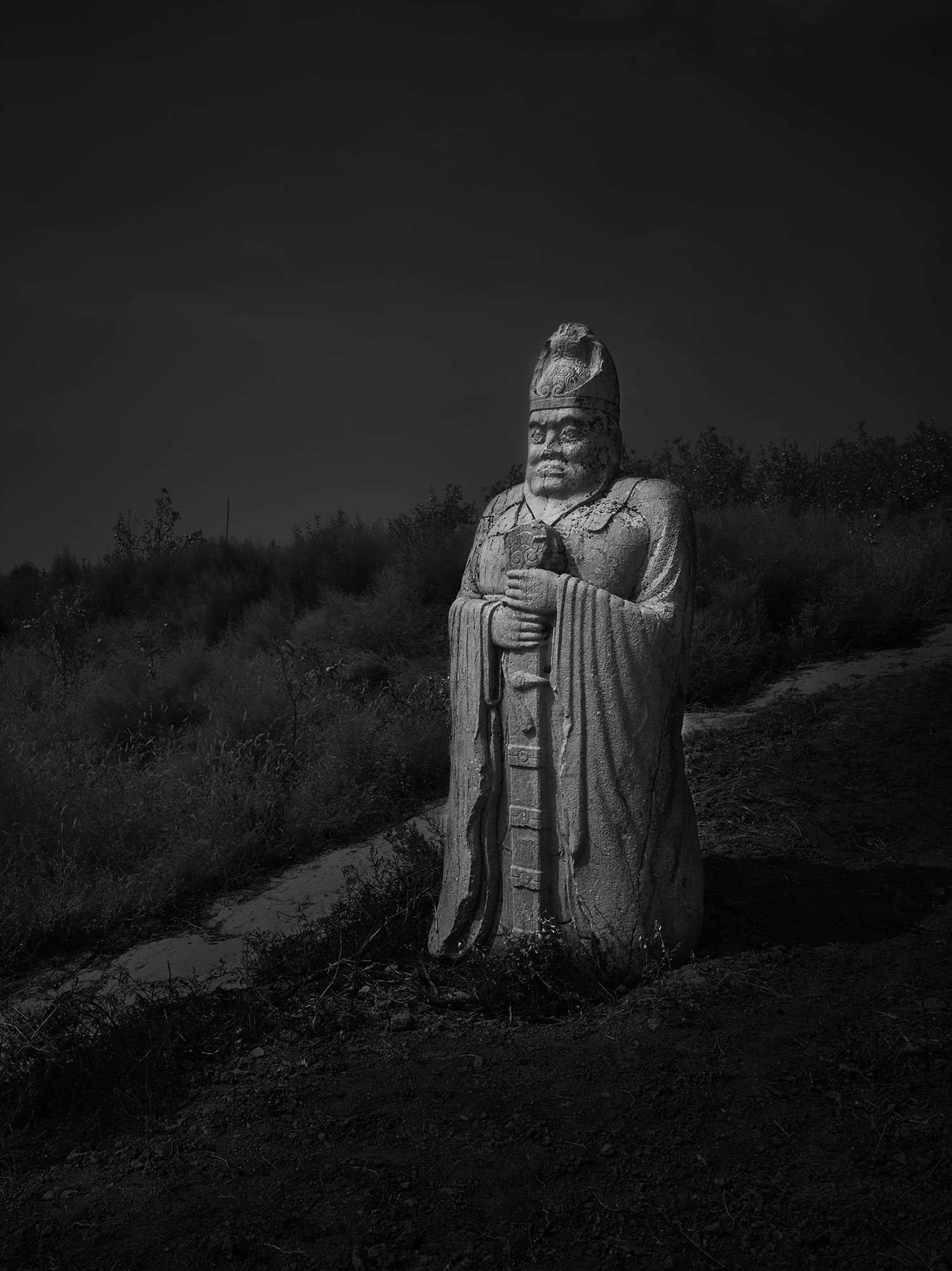 The photo portrays the mysterious and monumental stone funerary statues that accompany early Chinese emperors’ tombs. Dating from the Qin, Han, Tang, Song, and Ming dynasties, the rite of the Stone Statue epitomizes the power, wealth and sophistication of ancient kingdoms whose grandiose relics are reminders of China’s disappearing heritage.