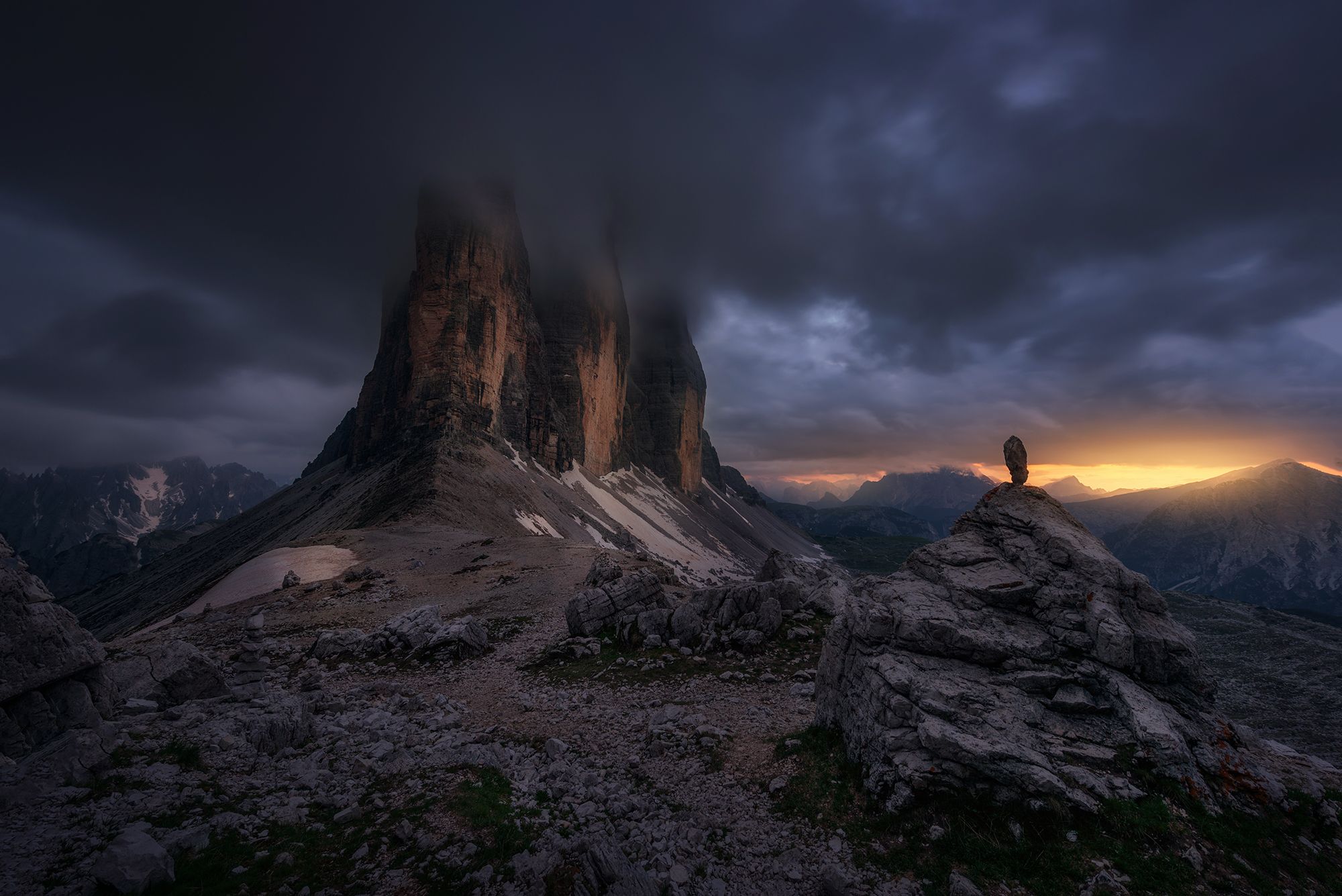 Sunset on our way to Locatelli Dreizinnenhütte. Tre Cime were so bright with this light and the clouds were moving so slow that we had to make a long exposure in order to capture the movement. Behind you can find the Cadinis.