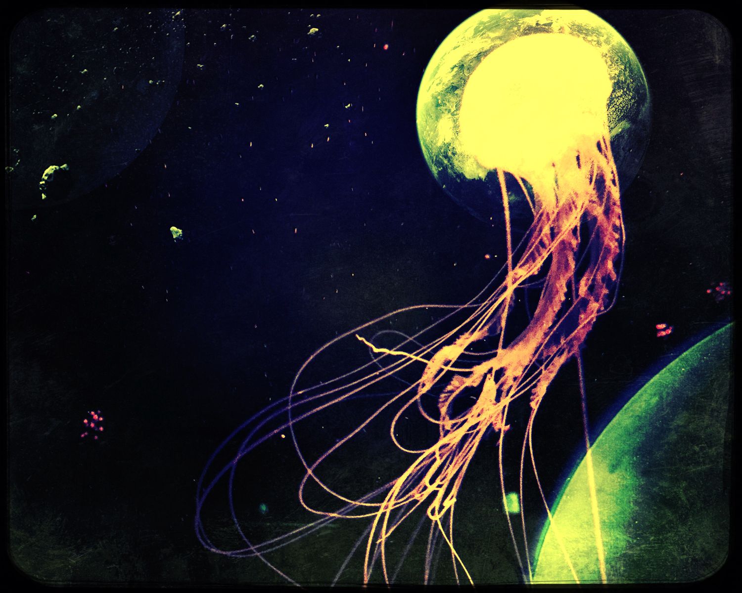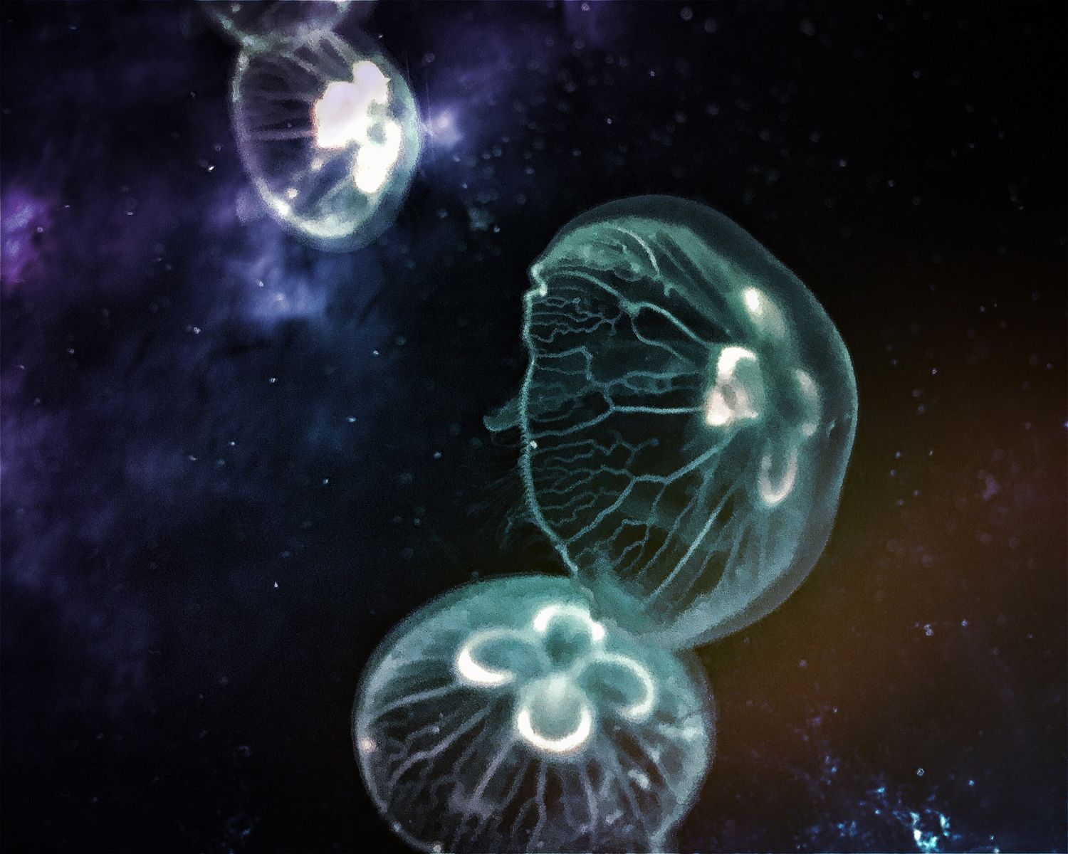 Through personification and imagination, groups of the jellyfishes float in the universe with ease. Looking forward to escaping from this culturally diminished and value corrupted world to preserve some elegance, warmth, and luster.