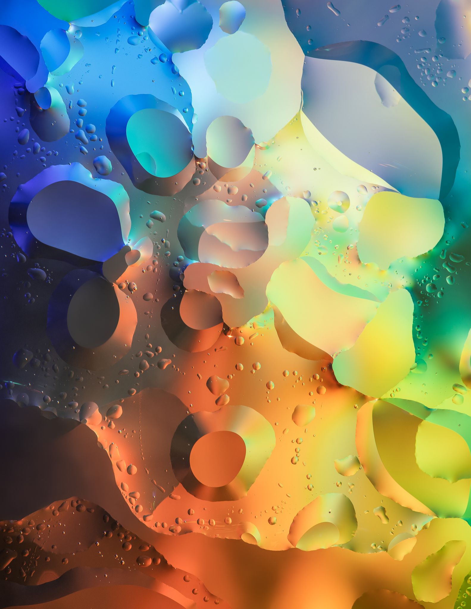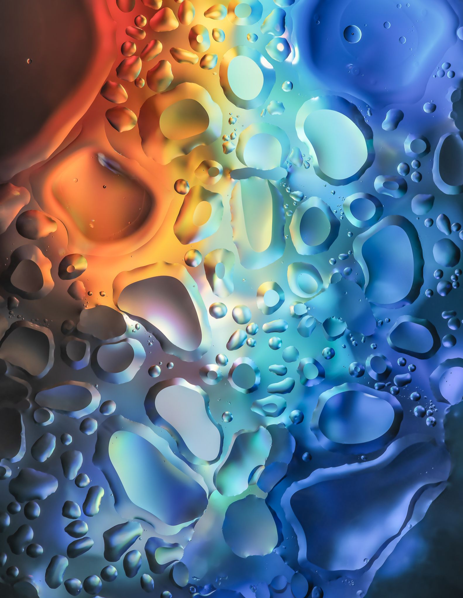 A series of images exploring the properties of density and immiscibility when oil, glycerine and water are combined. The use of spectral light generated from prisms in sunlight allowed the intriguing shapes of the clear, colorless liquids to be made visible.